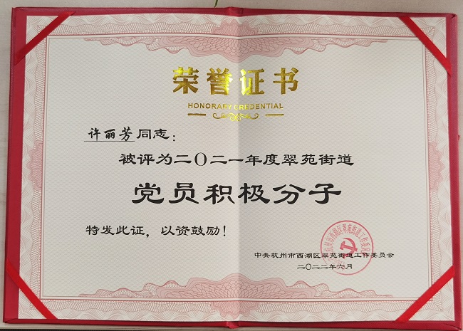 近日,杭州市西湖區(qū)翠苑街道召開(kāi)2022年七一表彰暨“爭(zhēng)星晉位·全域建強(qiáng)”動(dòng)員大會(huì)。街道全體區(qū)管干部、機(jī)關(guān)全體黨員、各社區(qū)黨委書(shū)記、副書(shū)記等人參加會(huì)議,頤高集團(tuán)黨委榮獲“先進(jìn)基層黨組織”榮譽(yù)稱(chēng)號(hào),許麗芳同志被評(píng)為2021年度翠苑街道黨員積極分子,陳貴寶同志榮獲“光榮在黨50年”紀(jì)念章,集團(tuán)黨委直屬二支部黨員藍(lán)彩萍同志踴躍參與無(wú)償獻(xiàn)血,直屬一支部黨員嚴(yán)鵬帥同志積極參加“迎七一 守初心 溫誓詞”集中宣誓活動(dòng),各支部黨員以實(shí)際行動(dòng)致敬黨的101歲生日。