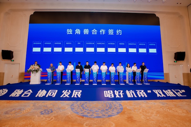 杭甬新生代獨(dú)角獸企業(yè)作為杭甬雙城開辟新領(lǐng)域新賽道的生力軍,是科技領(lǐng)軍企業(yè)的后備軍,是科技骨干企業(yè)的主要力量。10+獨(dú)角獸企業(yè)代表:甬江科創(chuàng)區(qū)建設(shè)領(lǐng)導(dǎo)小組辦公室副主任 汪樂軍、杭州云棲小鎮(zhèn)管理委員會黨委書記,主任 袁駿、衢州市招商中心副書記、副主任 葉方成、蔚車創(chuàng)始人&CEO 戴其其、杭州姆珉網(wǎng)絡(luò)科技有限公司創(chuàng)始人 徐杭、橙愿文化創(chuàng)始人兼CEO 胡寧峰、浙江融象數(shù)字科技有限公司總裁 陳宇飛、全球貿(mào)易通總裁 陳建旭、樓友會副總裁 錢寧澤、寧波明禾新能源科技有限公司董事長 盧杭杰、寧波歐熠樂科技有限公司聯(lián)合創(chuàng)始人 王安、藍(lán)帆互娛總經(jīng)理 董世國于會上簽署了獨(dú)角獸合作簽約項(xiàng)目,為杭甬雙城經(jīng)濟(jì)高質(zhì)量發(fā)展注入強(qiáng)勁動力。