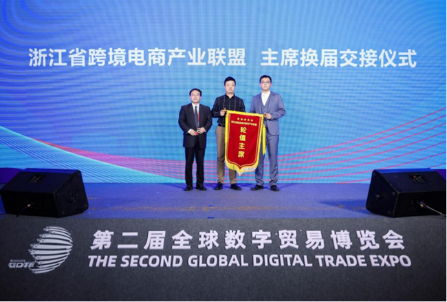 在大會(huì)現(xiàn)場(chǎng),中國(guó)(杭州)跨境電子商務(wù)綜合試驗(yàn)區(qū)·下沙園區(qū)、鄞州跨境電商集聚區(qū)上臺(tái)進(jìn)行輪值主席交接儀式。浙江省商務(wù)廳副廳長(zhǎng)張錢(qián)江為下一任輪值主席鄞州跨境電商集聚區(qū)頒發(fā)流動(dòng)紅旗。