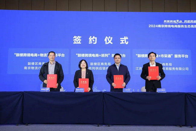 鼓樓區(qū)商務(wù)局局長周曉慧代表鼓樓區(qū)商務(wù)局與南京物流行業(yè)協(xié)會、江蘇班列供應(yīng)鏈有限公司、1039市采通平臺與鼓樓區(qū)商務(wù)局簽約“鼓樓跨境電商+物流”、“鼓樓跨境電商+班列”、“鼓樓跨境電商+市采通”入駐平臺服務(wù)協(xié)議。