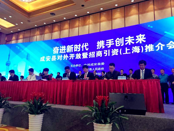 5月3日,成安縣對外開放暨招商引資(上海)推介會順利舉行,成安縣眾創(chuàng)空間、頤高新經(jīng)濟(jì)產(chǎn)業(yè)園項目簽約合作,邯鄲市副市長高和平,成安縣委書記薛洪志,縣長殷社林,縣人大副主任姚旭光,頤高互聯(lián)網(wǎng)科技股份有限公司總裁助理張燕杰等出席了此次簽約儀式。
