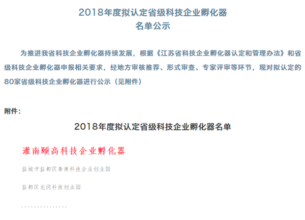 為推進(jìn)科技企業(yè)孵化器持續(xù)發(fā)展,根據(jù)《江蘇省科技企業(yè)孵化器認(rèn)定和管理辦法》和省級(jí)科技企業(yè)孵化器申報(bào)相關(guān)要求,經(jīng)地方審核推薦、形式審查、專家評(píng)審等環(huán)節(jié),江蘇省科技廳發(fā)布《2018年度擬認(rèn)定省級(jí)科技企業(yè)孵化器名單公示》,共有80家省級(jí)科技企業(yè)孵化器進(jìn)行公示,連云港市只有一家上榜,“灌南頤高科技企業(yè)孵化器”成功入選。
