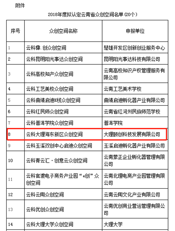 2018年11月5日至19日,按照《云南省眾創(chuàng)空間認(rèn)定管理辦法(試行)》(云科辦發(fā)〔2015〕4號)有關(guān)規(guī)定,經(jīng)州(市)科技管理部門推薦和省科技廳組織的形式審查、專家現(xiàn)場核查、會議評審等工作程序,并經(jīng)省科技廳廳務(wù)會審議,大理頤創(chuàng)科技發(fā)展有限公司—大理海東新區(qū)雙創(chuàng)中心等20家眾創(chuàng)空間獲批云南省省級眾創(chuàng)空間。