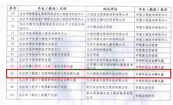 2019年3月25日,按照九江市科學(xué)技術(shù)局《關(guān)于批準(zhǔn)認(rèn)定(組建)2018年度市級科技創(chuàng)新平臺(載體)的通知》(九科字[2019]8號)有關(guān)規(guī)定,經(jīng)市科技管理部門推薦、專家評審和實(shí)地調(diào)研論證等工作程序,九江(頤高)互聯(lián)網(wǎng)創(chuàng)業(yè)中心等20余家企業(yè)獲批市級科技企業(yè)孵化器。