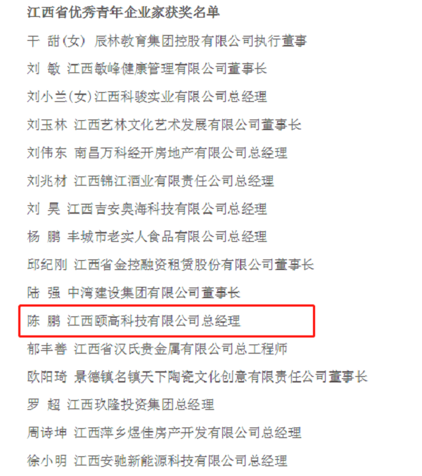 2019年9月,第七屆“江西省杰出(優(yōu)秀)青年企業(yè)家”評(píng)選活動(dòng)正式開始,評(píng)選活動(dòng)由團(tuán)省委、省工商聯(lián)、江西日?qǐng)?bào)社指導(dǎo),江西省青年企業(yè)家協(xié)會(huì)、江西省非公有制經(jīng)濟(jì)發(fā)展服務(wù)中心、江西日?qǐng)?bào)社大江網(wǎng)、信息日?qǐng)?bào)社聯(lián)合開展。