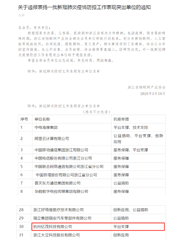 3月18日,浙江省物聯(lián)網(wǎng)產(chǎn)業(yè)協(xié)會(huì)對(duì)包括阿里云、???、大華、億茂科技等在內(nèi)的52家會(huì)員單位在疫情期間防疫工作的突出表現(xiàn)進(jìn)行通報(bào)表?yè)P(yáng)。